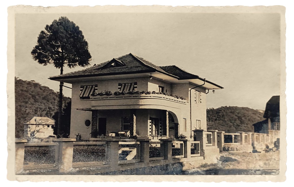 Para todos verem: imagem de uma fotografia em preto e branco mostra uma casa com arquitetura que lembra o estilo colonial ou do início do século 20. A casa tem um telhado de duas águas com telhas aparentes, uma varanda com colunas retangulares e uma área murada na frente feita com pilares e grades. Há uma árvore grande e frondosa ao fundo, e a casa está rodeada por vegetação, sugerindo que está localizada em uma área mais rural ou de campo. A foto tem bordas com aparência desgastada, reforçando o aspecto antigo da imagem.